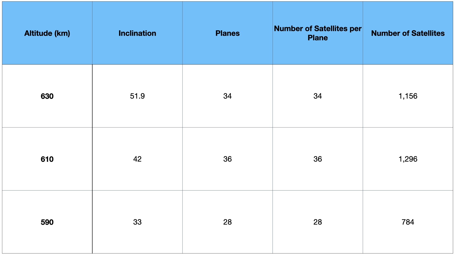 The proposal notes it would consist of “7,774 satellites in five altitude and inclination combinations between 590 and 650 km, including two polar shells.”